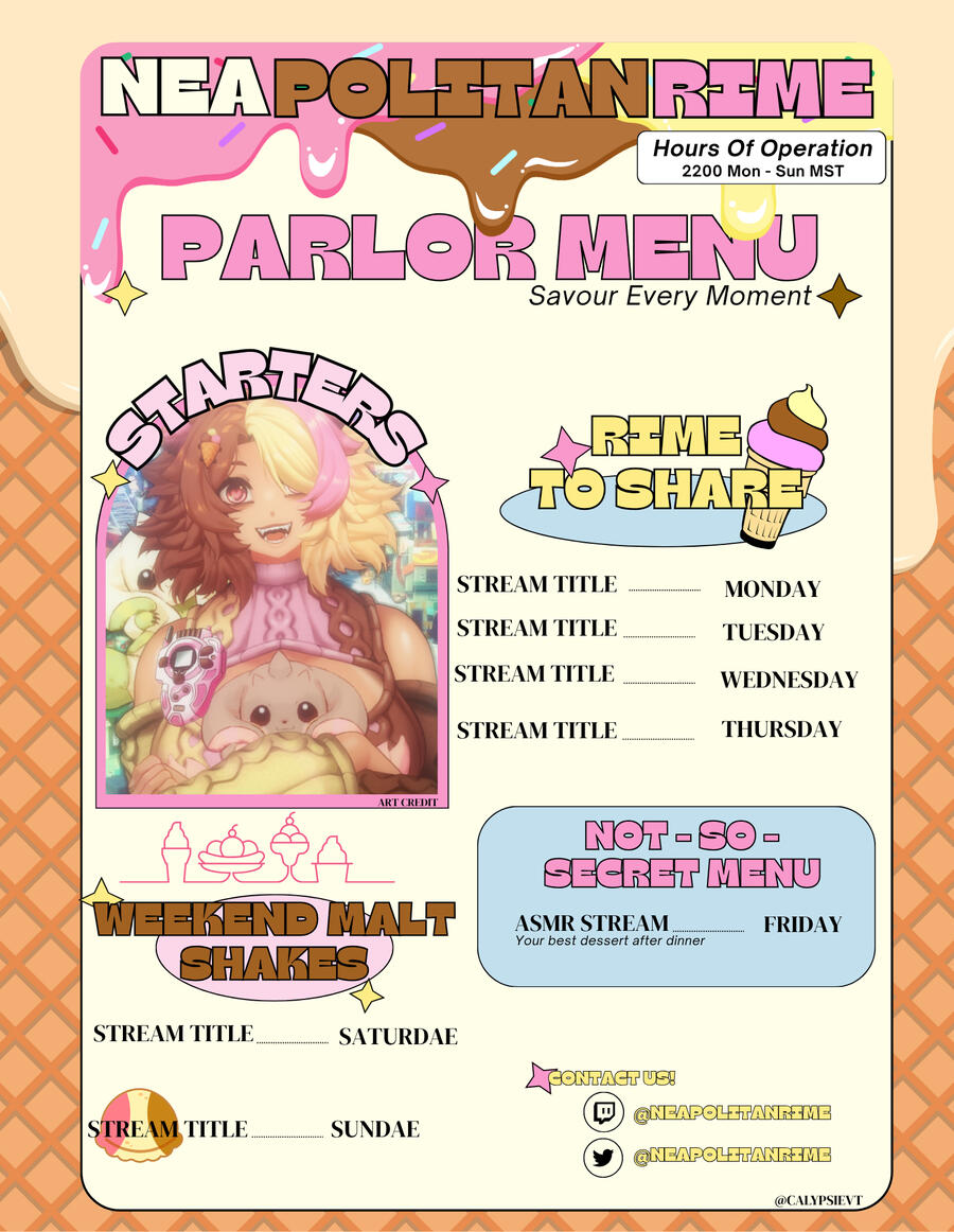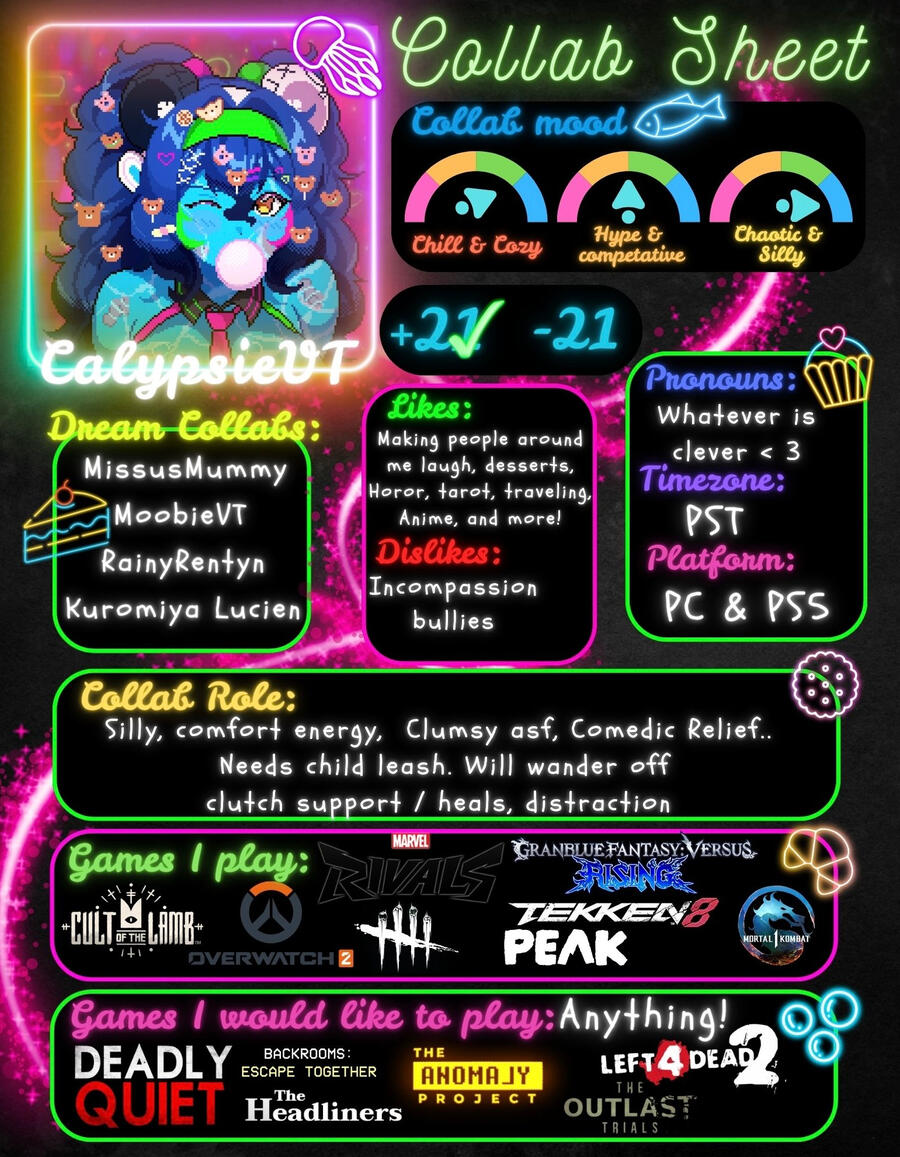 I love plushies, praise, surprises, and sunflowers! When I’m not working at my bakery; Sweet Escape; I’m Bein’ an Anarchist saving Neo Brooklyn, New York to my favorite playlist, I’m locked in my room sleeping, or spendin’ time with my Punks in an arcade! I love gaming and have been doing it since I can remember, now though I’m slaying crane games, learning art, and making everyone around me smile; I never lose!